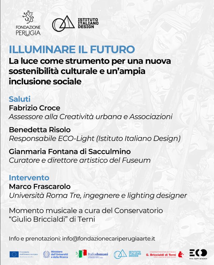 A introdurre la lezione saranno Fabrizio Croce, assessore del Comune di Perugia con delega al Turismo, città storica, spettacolo dal vivo e creatività urbana, rapporti con le associazioni culturali, economia della notte e Benedetta Risolo, responsabile del progetto ECO-Light per l’Istituto Italiano Design.