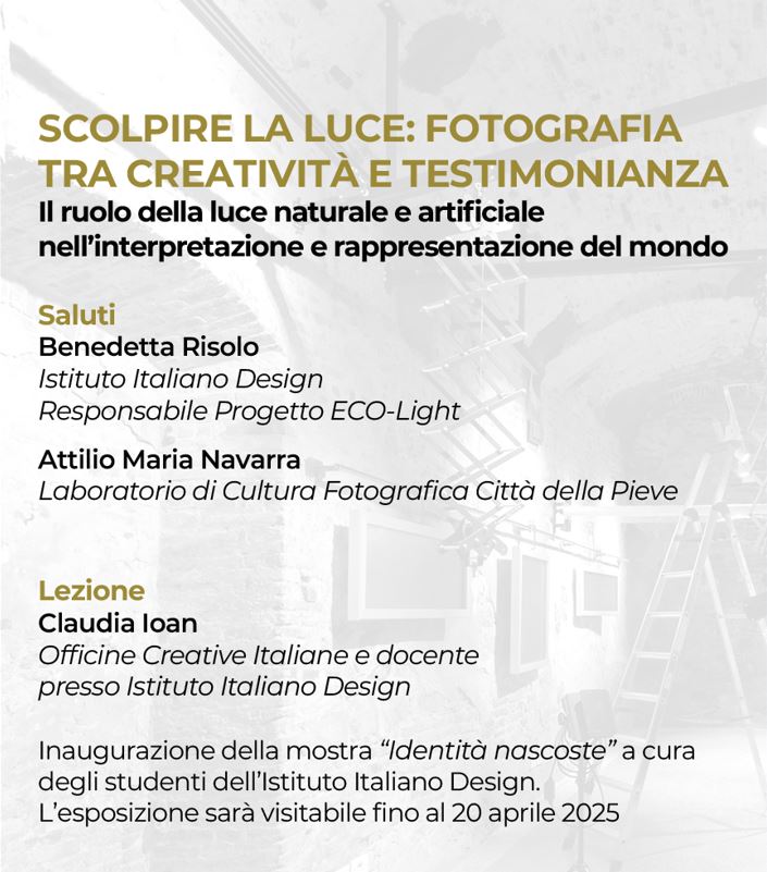 “Scolpire la luce: fotografia tra creatività e testimonianza”. Questo è il tema del quarto evento formativo di SPOTLIGHT, un percorso itinerante dedicato alla cultura della luce promosso dall’Istituto Italiano Design e dalla Fondazione CariPerugia Arte. L’appuntamento è previsto con ingresso libero venerdì 11 aprile alle 11 al Laboratorio di Cultura Fotografica di Città della Pieve (Via F. Melosio, 20/26 – Città della Pieve)